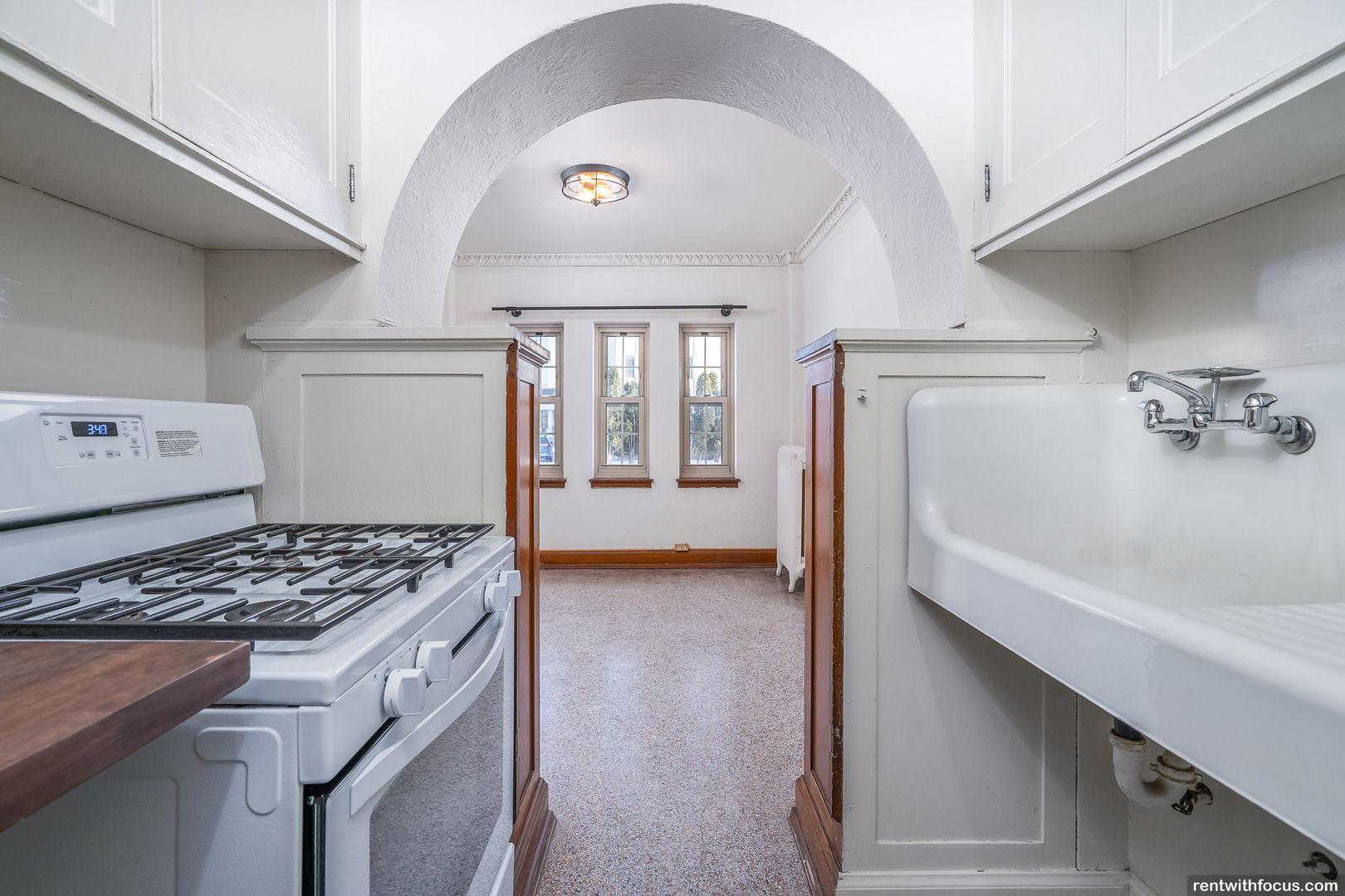 Prepare your favorite meals in the fully equipped kitchen, complete with a beautiful butcher block countertop and a farmhouse-style sink that adds a rustic charm. The unique lighting fixtures throughout the apartment create a warm and inviting ambiance, perfect for relaxing after a long day.